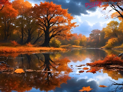 Staw, Drzewa, Las, Grafika AI, Jesień