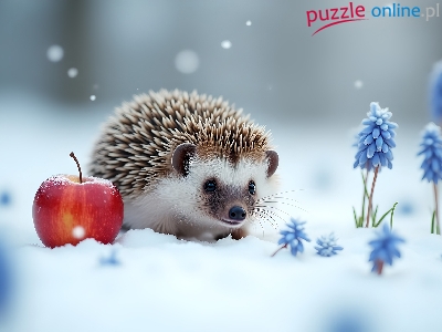 Szafirki, Jeż, Kwiaty, Grafika, Niebieskie, Jabłko, Śnieg