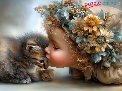 Mały, Dziewczynka, Kot, Grafika AI, Kwiaty