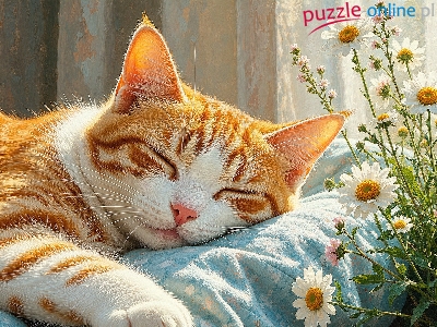 Rudy, Kot, Śpiący, Grafika AI, Kwiaty
