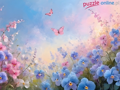 Niebieskie, Kwiaty, Różowe, Grafika AI, Motyle