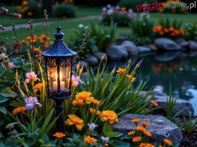 Latarnia, Staw, Kwiaty, Grafika AI, Ogród