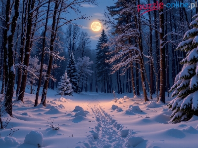 Księżyc, Zima, Ścieżka, Grafika, Drzewa, Las, Noc