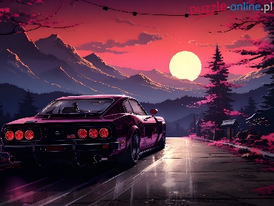 Samochód, Góry, Droga, Grafika, Zachód słońca