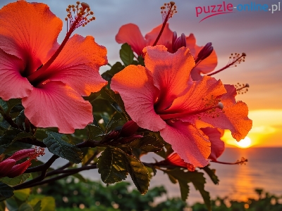 Czerwone, Kwiaty, Hibiskusy, Grafika, Zachód słońca