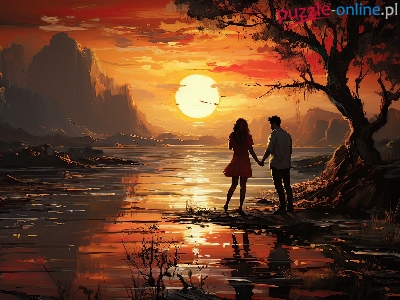 Zakochani, Góry, Jezioro, Grafika, Zachód słońca