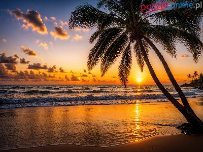 Plaża, Morze, Palmy, Grafika, Zachód słońca