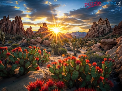 Kaktusy, Skały, Pustynia, Grafika, Promienie słońca