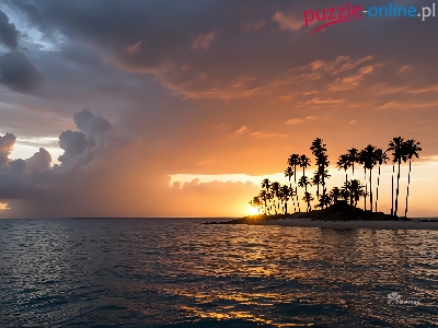 Ocean, Palmy, Wyspa, Grafika, Zachód słońca