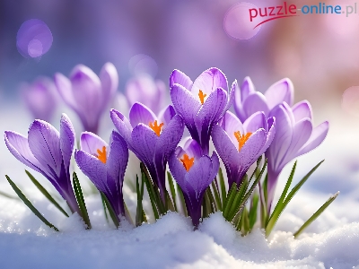 Puzzle Åšnieg, Fioletowe, Krokusy, Grafika