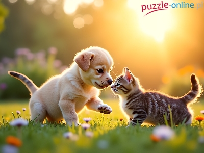 Szczeniak, Kot, Pies, Grafika AI, Trawa