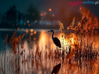 Czapla, Woda, Trawy, Grafika AI, Zachód słońca