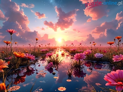 Kwiaty, Odbicie, Woda, Grafika AI, Zachód słońca