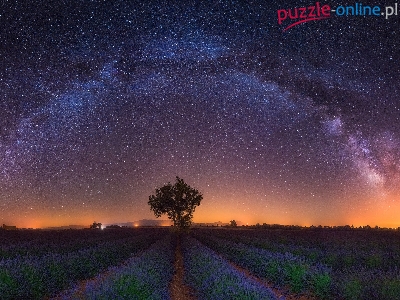 Drzewo, Pole, Noc, Droga Mleczna, Niebo, Lawenda, Gwiazdy