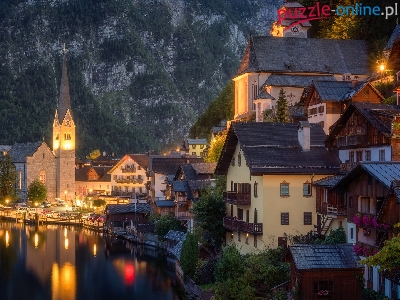 Kościół, Jezioro Hallstattersee, Góry, Austria, Domy, Oświetlone, Hallstatt