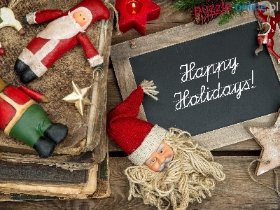 Happy Holidays, Gwiazdka, Mikołaj, Vintage, Koniki, Świeca, Napis, Świąteczna, Deski, Miś, Zabawki, Kompozycja, Tablica, Książki