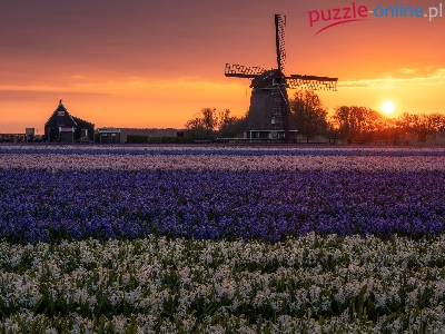 Drzewa, Kwiaty, Wiatrak, Hiacynty, Zachód słońca, Pole