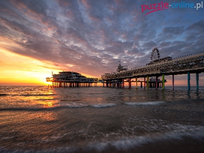 Zachód słońca, Scheveningen, Holandia, Morze, Chmury, Molo