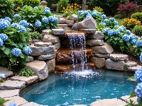 Ogród, Hortensje, Kwiaty, Kaskada, Kamienie