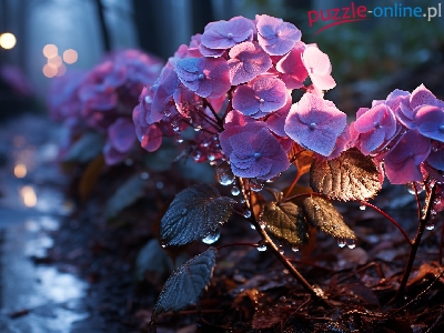 Krople, Kwiaty, Fioletowe, Hortensje, Wody, Listki