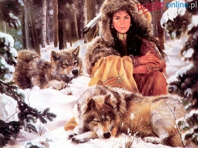 Indianka, Zima, Dziewczyna, Młoda, Wilki