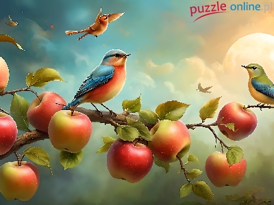 Kolorowe, Jabłka, Ptaki, Grafika, Gałąź