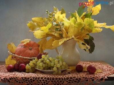 Bukiet, Wazon, Talerz, Dynia, Winogrona, Koszyk, Kompozycja, Liście, Jabłka