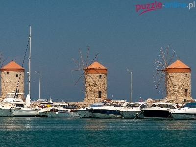 Port jachtowy Mandraki, Motorówki, Grecja, Wyspa Rodos, Wiatraki