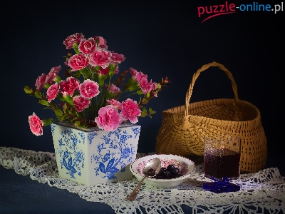 Doniczka, Jagody, Szklanka, Miseczka, Goździki szabo, Koszyk, Napój