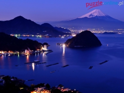 Wulkan, Japonia, Oświetlone, Fudżi, Noc, Góry, Wyspa, Domy