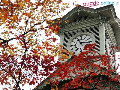 Japonia, jesień, wieża zegarowa, Sapporo, liście