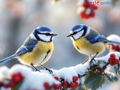Gałęzie, Dwa, Modraszki, Jarzębina, Sikorki, Ptaki, Śnieg