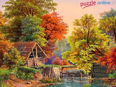 Jesień, Staw, Malarstwo, Domek, Drzewa, Widoczek