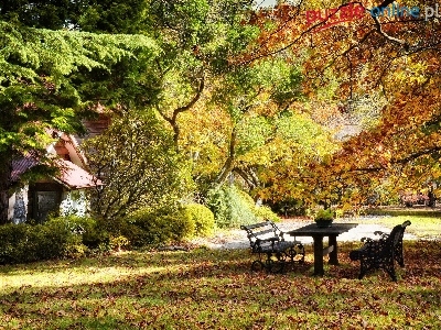 Jesień, Altanka, Park, Drzewa, Ławeczki