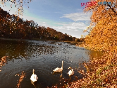 Puzzle Łabędzie, Jezioro, Jesień, Drzewa