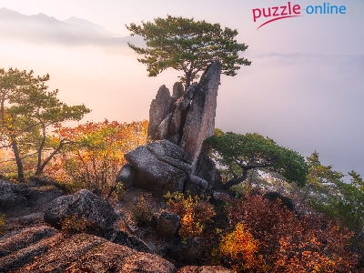 Puzzle Mgła, Skały, Drzewa, Jesień