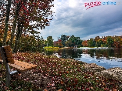 Miasto Trumbull, Stan Connecticut, Jesień, Ławeczka, Kamienie, Jezioro, Stany Zjednoczone, Park Twin Brooks, Park
