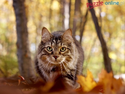Jesień, Drzewa, Kot, Morda, Liście