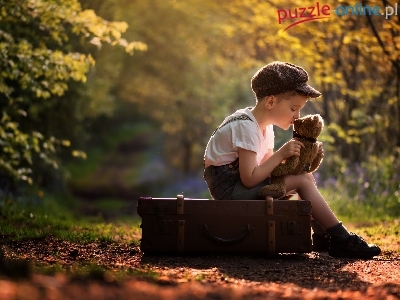 Pluszowy, Jesień, Las, Walizka, Chłopiec, Miś, Droga