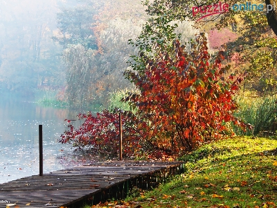 Pomost, Jesień, Liście, Mgła, Drewniany, Jezioro, Kolorowe