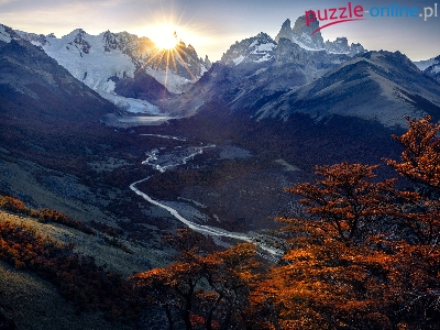 Jesień, Drzewa, Promienie słońca, Patagonia, Góry, Rzeka, Argentyna, Andy