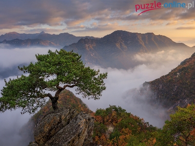 Mgła, Góry, Sosna, Jesień, Drzewa, Skały, Chmury