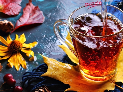 Jesienne, Herbata, Kwiaty, Szklanka, Napój, Liście