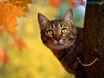 Puzzle Jesienny, Kot, Drzewo, Liść
