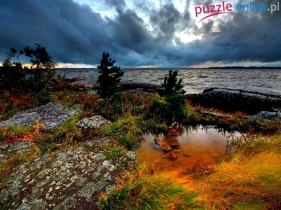Puzzle Jeziora, Chmury, Brzeg, Roślinność