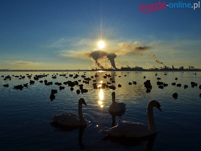 Puzzle Łabędzie, Jezioro, Słońce