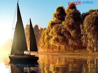 Jezioro, Wschód słońca, Jesień, Żaglówka, Drzewa