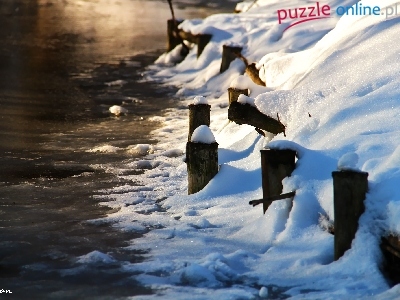 Jezioro, Kołki, Śnieg, Brzeg, Drewniane