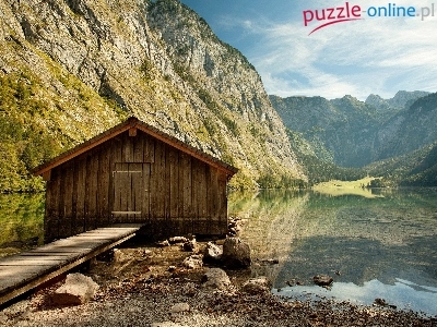 Puzzle Jezioro, Kładka, Chatka, Góry