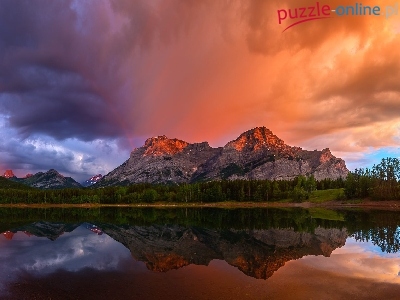 Chmury, Jezioro, Odbicie, Góry, Zachód słońca, Drzewa